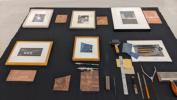 会場1 版画の銅板や道具の展示