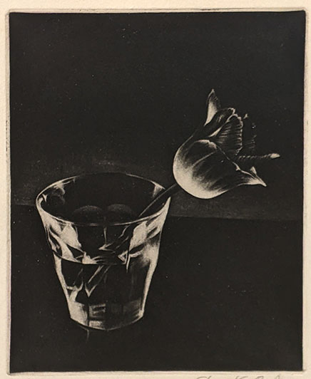 小品が幾作も並んでいる。顔は光の部分7、影3といった割合、それが人物像の陰影をすっと伝えている。クラシックな技法とは思われつつ、惹き付けるものがある。特に、チューリッブⅡと題された、ガラスのコップにチューリップが一輪生けられた作品は絶妙な耀きを放ち、可能なら頂きたい――という気持ちを起こさせた。