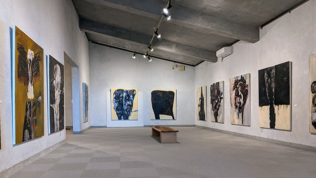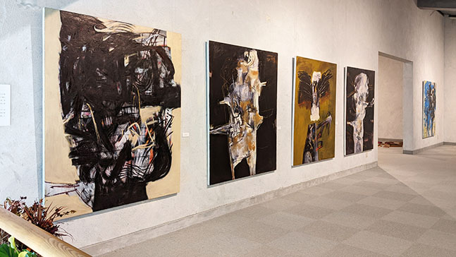 岩瀬氏のF100号の作品が15点並ぶ今回の個展は、作品のインパクトが強く反響が多かった。抽象のような具象のような、抽象表現主義なのか新表現主義なのかは定かではないが、動物園でスケッチしたりすることも多いという作者のお話から野生動物のイメージもありそうで文字通り野獣派だ。新表現主義はかつての暴力的、野獣派のフォービズムを起源とし、アメリカでは抽象表現主義となるが反動的に再び具象化しニューペインティングが生まれ、その名称はともかく今なお世界的には主流といえるようだ。
