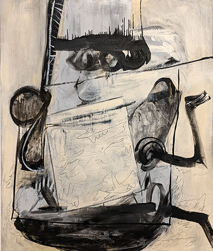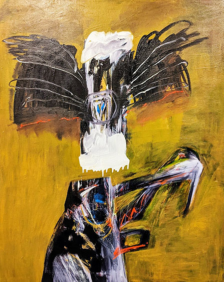人間は複数のペルソナ(イタリア語で仮面を意味する)を持つ。作品の表情は一つの顔、複雑怪奇な人間の精神を多角的に描き出した像なのである。次に、作品「無言」である。主題は、当然ながらUntitledではない。作家は絵画表現について考慮した。絵画の表層から発せられるのは、色彩と形態等による絵画言語であるということを。日常性において、時に「沈黙は金なり」であれば、敢えて無言であることの重みは理解できよう。画面からは、不満や不服を示唆する強い言語が発せられている。次に、作品「原始」である。