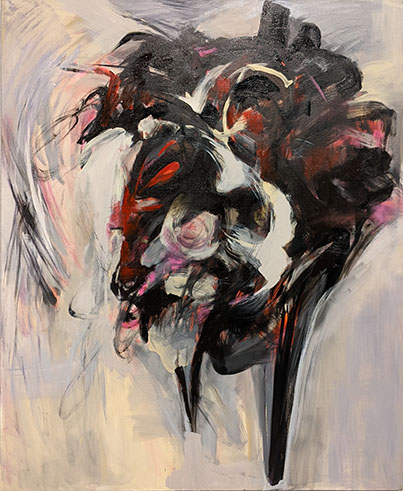 岩瀬晶子の抽象絵画は大変力強く、画面の有機的形象の動きに勢いがある。今展で見せた、最近数年間の作品を観た率直な印象である。現代は、抽象絵画が振るわない具象絵画隆盛の時代だ。主に’80年代以降のアメリカの絵画シーンが具象絵画に変化した影響が続いている。心象具象絵画も流行る。だが、岩瀬の抽象絵画は表現主義的な強さを持つ。