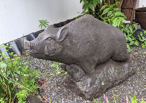 一方、偶然だが、その数日前に当館の庭に、ほとんど実物大の猪の石像が設置された。八覚正大氏が路上観察中に発見したもの(メッケラート)で、建物撤去とともに処分される予定だったものが管理者の了承を得て急遽当館の展示物となった。この猪像はかなり古い物でサインはないものの彫刻家によるものと推測され、いわくも謎だらけだが、まるで今回のビデオに登場する猪のように思えてしまう。(写真は鼻先など一部補修中)