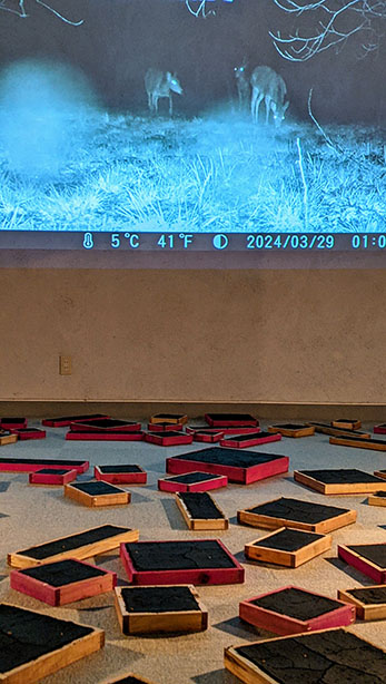 一方、現地に設置した定点ビデオカメラは動物の動きに反応し30秒の動画が自動で撮られる仕組みで一週間設置され、7分の動画が撮れた。その映像はまさに野生動物である猪や鹿が徘徊する真夜中の森の光景であり、暗闇の中でまるでLEDのランプのように目を光らせて動き回る動物の生態が捕えられた。作物を荒らす猪や鹿だが、彼らにとって人間の迷惑など関係ない。これらは人間の論理は通じない動物のパフォーマンスアート。床に配置された人工地盤と、夜間に撮影した現地のビデオ映像をプロジェクターにより壁面に投影した組み合わせに多くの人が興味深く見入っていた。床には人間が歩く事が出来る獣道があり、最近はやりの没入型アートとしても楽しめる。