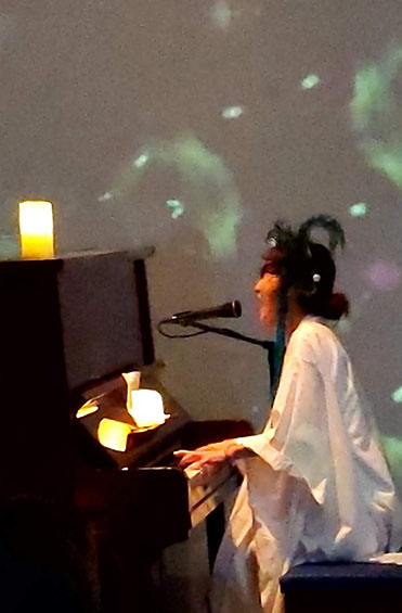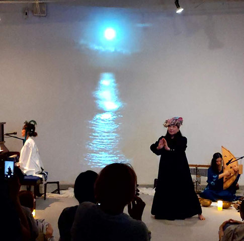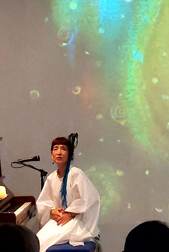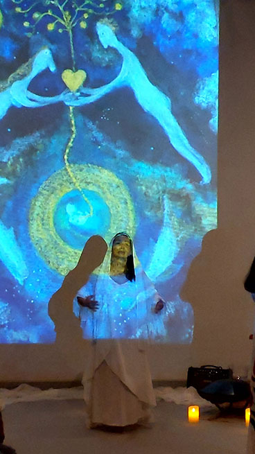 生命と宇宙はRynco氏の一貫したテーマ。今回は「へその緒」という永遠に続く命をテーマとした壮大なもの。彼女はシンガーソングライターでありペインターでもある。今回、映像に多用されたのはRynco氏のイラスト。ダンサーの有田氏の受胎の時に撮られた映像や自作の絵画を散りばめた映像ソフトが素晴らしい。数多くのイベントをされているが、毎回、完成度が高い。今回も音楽、映像ともに感動的なイベントであった。