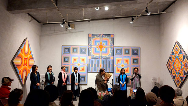 実は前日、所用ついでに館にお伺いしたところ館長が奥様と会場づくりをされている所だった。その奥の部屋の聖なる壁には二紀和太留作の最高傑作『荘厳』(トリプティック)が飾られ(十数年前 この美術館と出逢った最初の感動そのままに)、両脇にさらに明るい色彩の情緒を醸し出すメカニックな作品が『荘厳』を引き立てるように二重のトリプティックな配置がなされていた。椅子が多少の高低取り混ぜ六十脚用意され、その空間が参会者で埋め尽くされる光景が見るようだった。