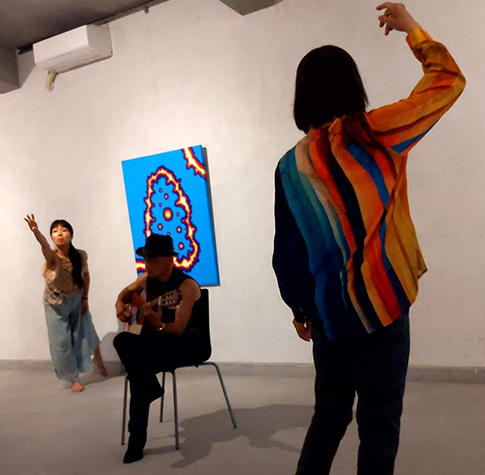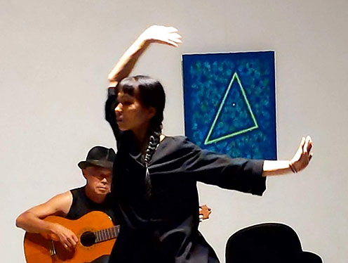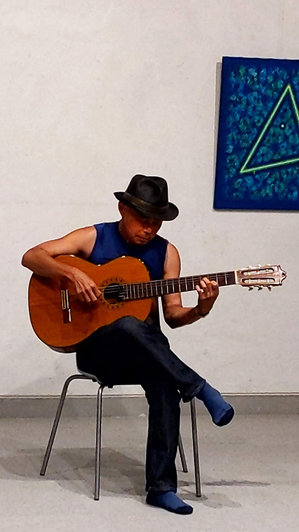 野村氏は画家でもあるギタリスト。二日間であるが自身の絵を二室に展示すると同時に独自の作曲による演奏会を開いた。前代未聞の同一人物による音楽演奏会と絵画の展覧会だが、両方とも素人の域ではない。その絵は、光る線などをイメージできる抽象的な物で、背景の色から浮かび上がり、その背景もよく見ると一色ではなく複雑である。一見、ポップアートのように見えるが歯ブラシなども用いるらしく独自の画法といえ興味深いものだった。その不思議なミニマリズムの抽象画と音数の少ない音楽は関係しているのかもしれない。自作の曲は現代曲の範疇とはいえ、心地よい感じ。興奮というより瞑想的で、アンビエントな楽想で繰り返される旋律は、バッハのカノンにも通じる。彼の音楽に注目する専門家も演奏会に来訪された。