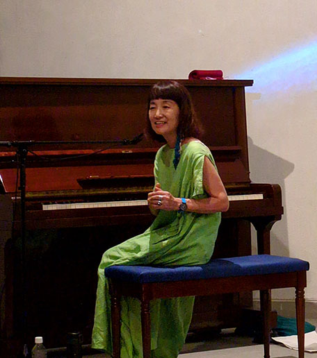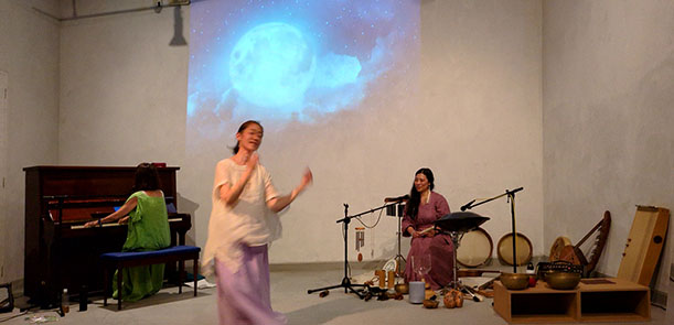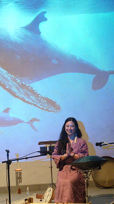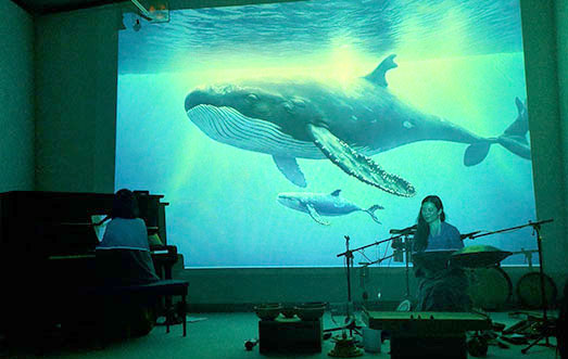巨大な壁面に巨大なクジラがゆったり泳ぐ様子が、スライドショーで投影される。まるで深海で実物のクジラを目にしながら音楽を聴いているような幻想に陥る。Ryinco氏のピアノと様々の楽器を自在に駆使するSaori氏の音楽が会場に満ちる。二人の歌を交えたセッションは聞きごたえがあるだけでなく題名のごとく心地がいい。すっかり癒されて、イベントは後半となる。演奏会は一時間をゆうに過ぎ、そろそろ演奏は終わったと思ったのだが、Ryinco氏は観客とトークを始めた。観客から紙に書いたメッセージをもらい、そのイメージを即興で、作詞作曲し、ピアノを弾く。それだけで驚異なのだが、Saori氏もそれに合わせて演奏し歌を歌う。さらに驚く間もなくハプニングが起きた。メッセージを渡した観客が踊りだしたのだ。それらの曲も踊りも見事なものだったが、歌と踊りが完全にシンクロし、終わるのもぴったり。そもそもRyncoとダンスの人は顔を合わせていない。奇跡的出来事が3人以上続き、ダンサーたちはプロの仲間だと推測したが、白昼夢のような出来事だった。