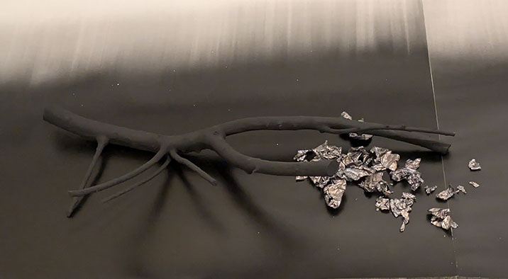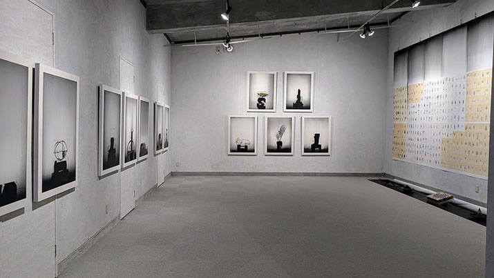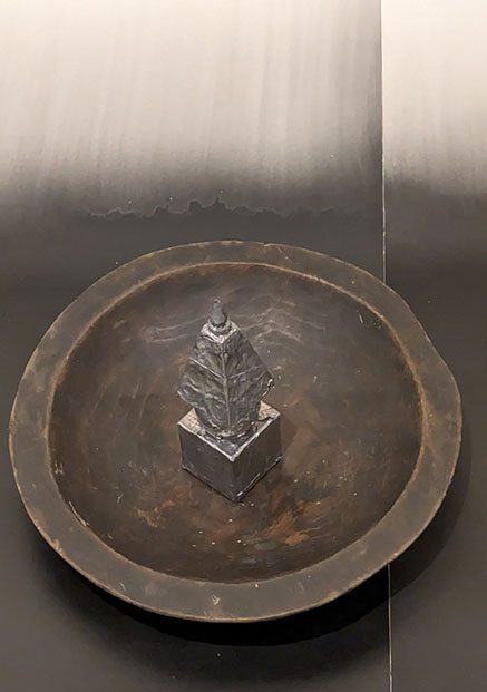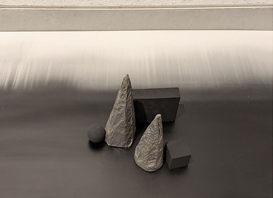 次に立体オブジェである。作者はこうした作品を、銀座のギャルリー志門でも平面作品と組み合わせて発表されていたので見覚えはあった。「有時一」の平面作品がシルエット風であれば、これらの作品は逆に影が立体化したような不思議な感覚。なにより形が明確で、それが黒であることにより、物は形だけの抽象となっている。全体にモノクロで静謐なたたずまいは平面作品と同じ。さらにそれらの作品の下には、モノクロの美しいグラデーションの紙が敷かれていて、これもまた平面作品と同じ方法である。立体と平面の世界を自由に作りだす園城寺ワールドとなっている。美術史的にはこうした試みの原点はキュビズム(立体派)にあるのではないだろうか。