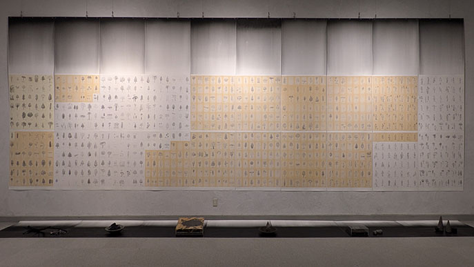 「有時一」は約112×82cmの大きい13枚の版画作品。「時のレクイエム」なる高さ3m、幅7.5mという巨大な840枚の鉛筆デッサン群の集合体。そして会場の床の長い紙の上に置かれた6つのオブジェ。