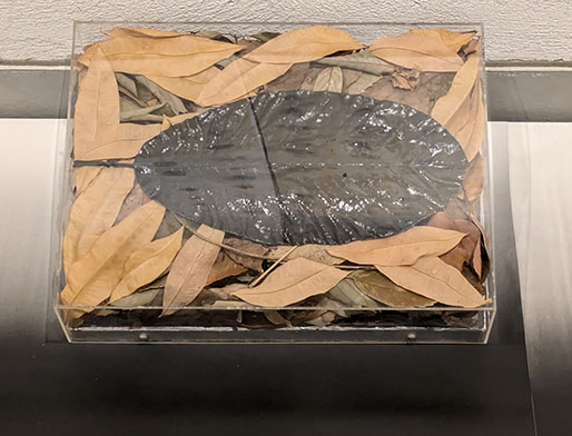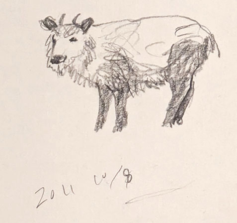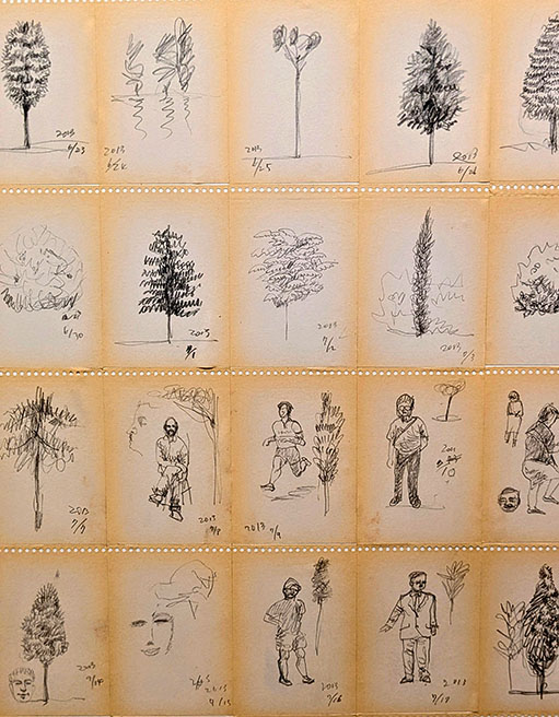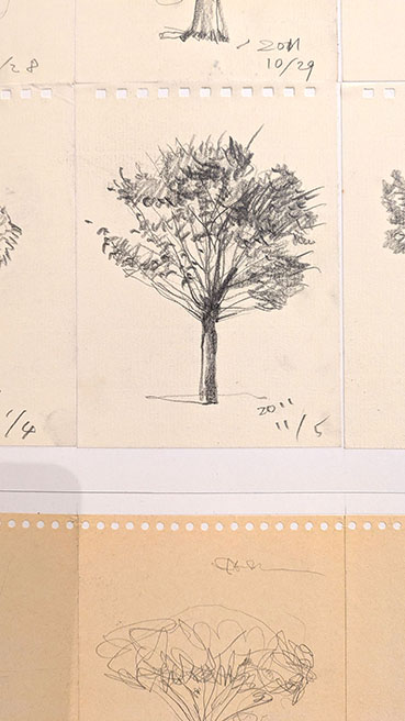 次に高さ3m、幅7.5mの「時のレクイエム」なる大作は、幅75×100cmの紙を縦に3枚、横に10枚つなげたもの。数えると約15×10cmのデッサン帖は計840枚。2011年、東日本大震災を機に始めた「絵描きだったらすべき」と始めたデッサンのテーマは身の回りの植物と人間。公園でのデッサンもあれば図鑑からの写生もあるという。面白いものは住まいの近くで出会ったというニホンカモシカ。さらになぜか二枚の裸婦もある。いずれも手慣れたデッサンだ。ところで、「絵描きだったら」という作者の言葉が頭に残った。室町時代、雪舟は中国から中国人画家らの樹木のデッサンのある「画帖」を持ち帰ったが、彼らは山水図などを描くとき、その画帖の植物を参考に、画面にそれらを自由にコラージュするように描いていくようだ。雪舟や狩野派はその方式をまねて画帖をつくりいろいろな絵を描いた。つまり当時、絵とは現地で景色を写生して描く、ということではなく画帖を元にコラージュを駆使した仮想現実の世界ということでもある。画帖には画家の画法のエッセンスが詰まっている。「絵描きだったら」それを持っていなくてはならないことになる。その集合体が今回の一つの巨大な作品となっている。そして840日は「時のレクイエム」として描かれた。それらは「有時一」であり二度と再生できないかけがえのない記録である。