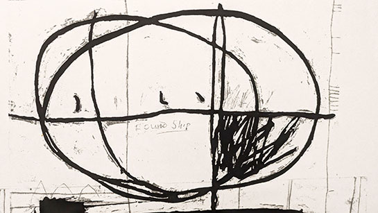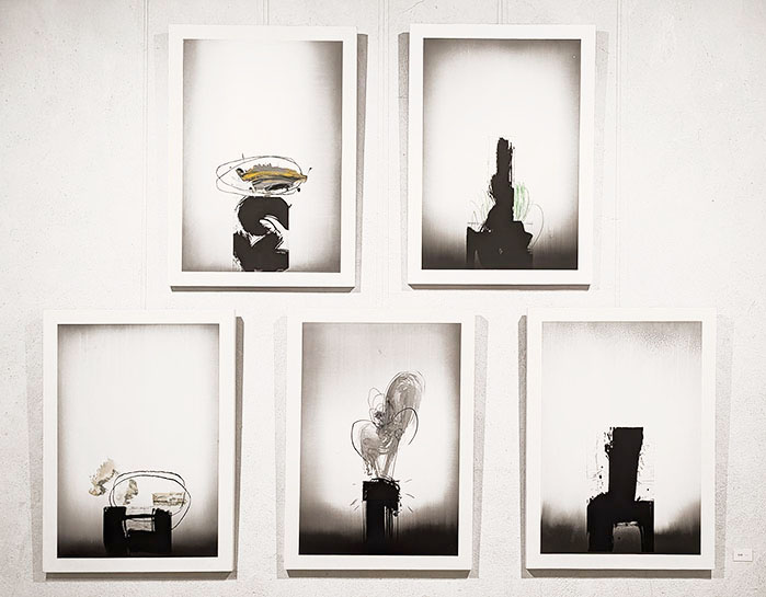 「有時一」とは禅の言葉。有は存在のことで時間と存在は一つだとしている。その作品の共通点は中央に黒い物体らしきものがあり、それはまさに存在を表している。作者は1970年代にフランスのヘイタ―教授の元で版画学んだ。現在の技法は銅版画に若干加筆という手法であるが一見して版画のようには見えない。まず、明確な構図、形があり背景はぼかしてある。その版画は書のドローイングの世界にも通じるものがある。さらにその特徴は中央のシルエット的な形と光にあふれた空間の対比。シルエットということは手前には物体があり向こうに光があるという事で、影ではなく陰ということ。その黒はすべての光を吸収してしまうかのように漆黒だ。さらにその背景は単純な白、余白ではなく墨によるグラデーションがある。ぼかしは水墨画のようでもあり、日本的なイメージがある。