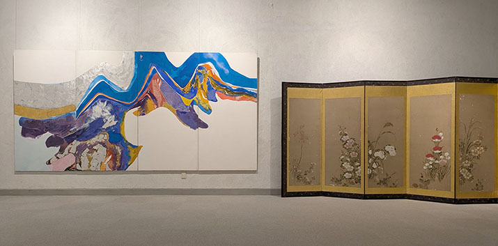 その作品の隣には、「伊年印」の押された宗達工房の作品が置かれている。この屏風絵は、特に赤い花の描かれた部分の発色、花茎の伸びなど見応えがあり、なかなかの存在感がある。平松輝子は宗達を心から尊敬し、その画風に対し文を書いたこともあったように思う。