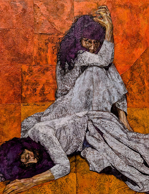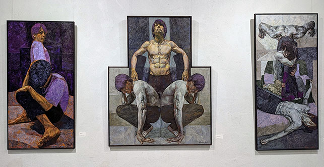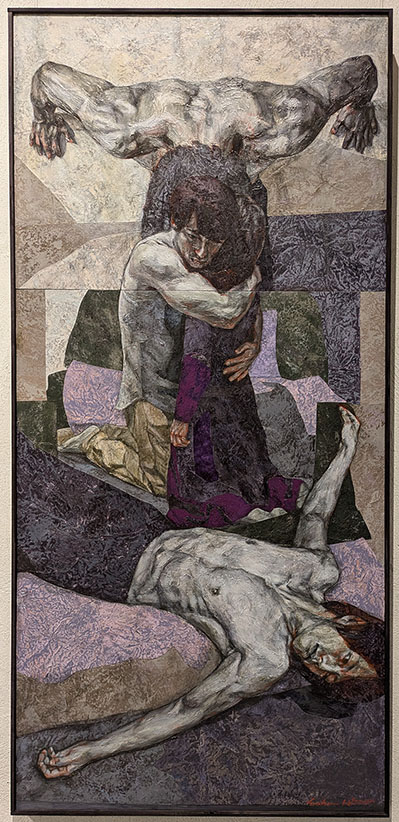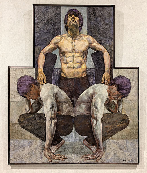 今回特に惹かれたのは、奥の聖なる壁の右方にあった、「終わりのない夜」だ。上部の切れた十字架のような構図の中に、件の男性が三体、その真ん中に女性の後姿が一体。女性は力なく抱きすくめられている一方、上部の男性の両肩の力強さ、女性を抱いて一体化した献身性、そして力尽きて下部に仰向けに倒れた姿――その見事な構成が、命を守る男性のドラマとして屹立している。男性のモデルが誰なのか、作者との関係は……問うことの意味を希薄にさせるほどの〈説得力〉がそこに生れていた。《存在にともなう不安や怖れに、描くことによって向き合い克服しようとしてきました。……》とは作者の言葉。