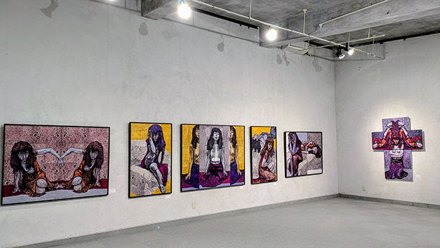 まず、上に艶のある仕上げ材が使われているのでわかりにくいが、和紙にアクリル樹脂絵具なのだ。洋画どころか日本画? さらに仔細に見ると画面がつぎはぎだ。つまりコラージュということ。こんなにコラージュを多用している作家は他にいるのか、思ったら、世界で初めてアクリル絵具で和紙に描いた平松輝子がいた。アメリカで発表した作品群や代表作「うるわしの大和のくに」がコラージュであった。コラージュのために下地を和紙とすることもノウハウがありそうだ。そして前述のように様々な人物のパーツがバラバラに画面に貼り付けられている感覚はオーストリアの画家、エゴン・シーレを彷彿とさせる。さらに「Still