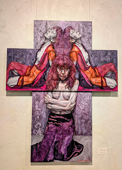mori」があり、まさに死を突き付けられるような女性の姿が、三体、十字の画布に描かれている。そして「暗闇に置き去りに」は、頭を抱えた女性と横たわる女性の描かれたもの、これも苦悩の底に達したような感覚が伝わって来て息をのんだ。さらに不思議な模様の背景がそれからの作品にはあった。……それらは、作者自身の検診で見つかった癌細胞、それを担当医師に頼み、画像として残したものだと。