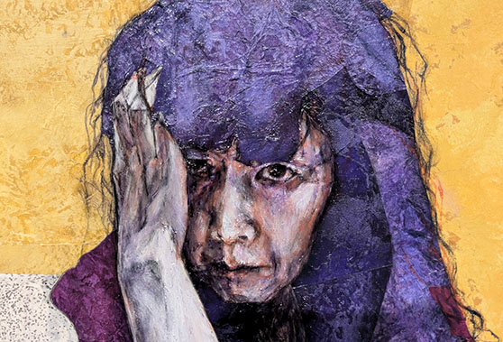 特に「PASSION2015」では、胸部のレントゲン写真があり、自らの体の奥に無言で潜む不気味なガンに罹患した自身の苦悩がよく表現されていて引き込まれる。大胆にも自分のがん細胞の写真を和紙に印刷し画面に張り付け、基調の色は怪しげな紫で部分的に血を思わせる赤色が混じり、てかてかした艶が生々しい。そしてその顔の表情は鬼気迫り、絶望感が伝わる。そのモデルの作者の言葉も胸にささる。しかし彼女は幸いにも完治した。Still