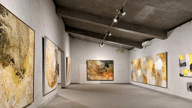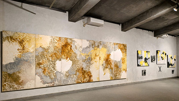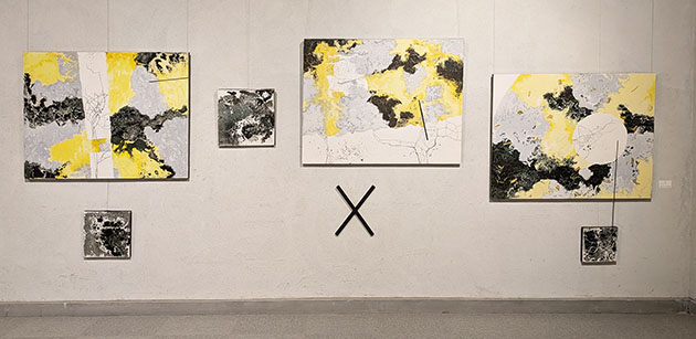 今回の新作である大小の6点の組作品。画面にはやはり凹凸がある。色は薄茶ではなく黄色と白のイメージで、完全なマット調で、やはり到底油絵には見えない。小さいモノクロで墨風の抽象もある。白い円形は月を想像させ、白に黒のクラック模様は割れた漆喰壁のよう。さらに調和を乱すかのように作品につながる黒のラインと×のマーク。これは単純な組作品ではなく、空間のコラージュでもある。