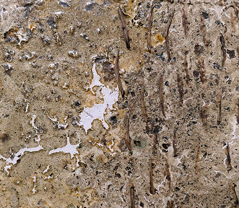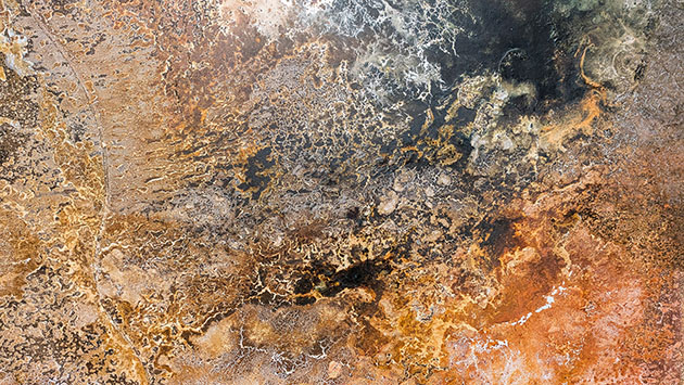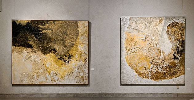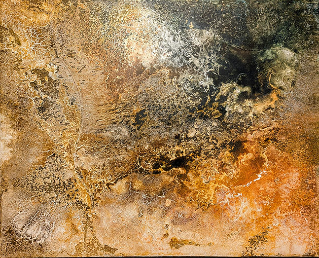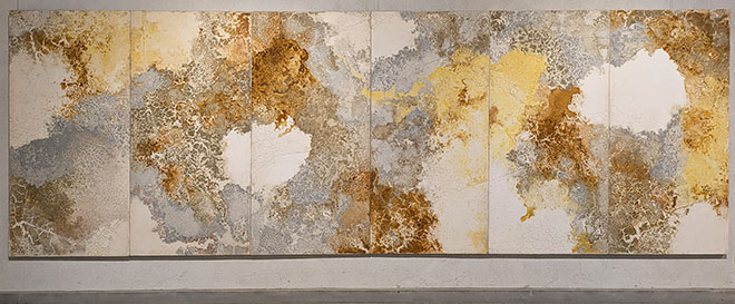 作者の技法に戻るが、床に置いた合板パネルに目止めして絵具を投げたり撒いたりし、さらに水をかけて乾くのを待つが、ある部分はひび割れが生じる。そうした人為と無作為の作業を積み重ね、自然の作用により完成することになる。それはまた、大地の表面の生成過程と似ているのかもしれない。