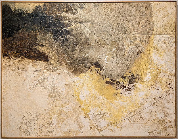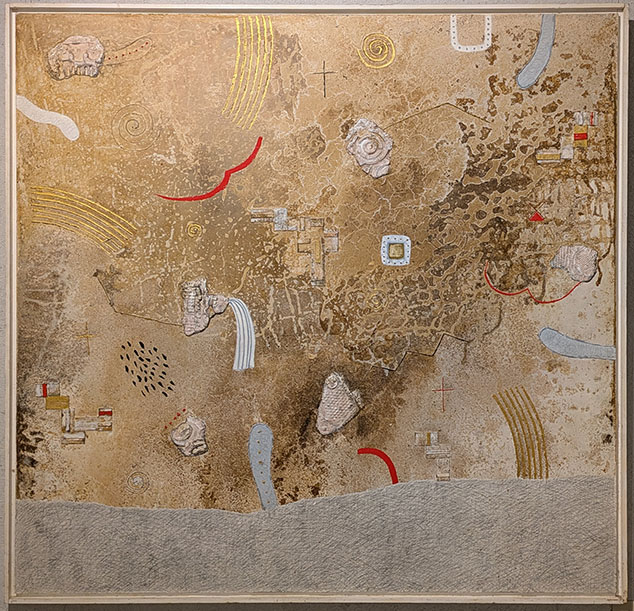の形、十字、渦巻き……それらが、混とんとした画面に、理知的なアイテムとして配置されているーーこれは、半ば無意識でありつつ、作者の知性の表現だろう~と(かつて理科系出身の評者は)語りかけてみたら、「あ、これは遊びですよ」と、軽くいなされた。でも、抽象美術であり、その偶然・混沌をエネルギーの基盤とされながら、やはりこの世での生活・制作の中で形を具現されてきたであろう作者の、来歴が現れているのでは……と詮索を残したまま、対話を終えた。