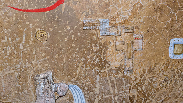 技法についていえば、彼女の画材は材料的にも絵具というよりは泥に近いイメージ。そして絵をよく見ると様々な異物を付けたり削ったりして痕跡をつける。岩絵の具は文字どおり岩から作られた。当館でかつて展覧会を開いたあるスペイン人の画家は、直接岩を削り小さく砕いてそれを直接平面に張り付け作品にしたが、その作品を移動させるとぼろぼろと土が会場に落ちた。そういえばアンゼルム・キーファーもそうしたイメージがある。艶のある部分があり、それらのマチエールはむしろ古美術の壺の釉薬のかかった表面のようでもあるが、それらで豊崎氏の作品が油絵であるということがかろうじてわかる。これらについての表現は独自だが当然多くの試行錯誤の努力があったのだろう。