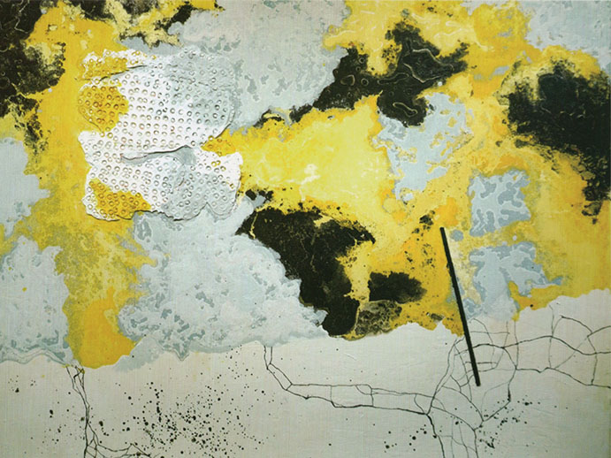 灰色の面に黄色、そして黒が入っている……抽象美術だと、まず感じられた。中に白い円があり、そこから紐にぶら下がった小さな画布が。どんな意図なのか、遊び心か……。その隣の作品は、地図のような黄色、黒の領域を持ち、ひび割れた線や、○マークの粒が百、二百はあるだろうか。今度はその下に黒い×印が。