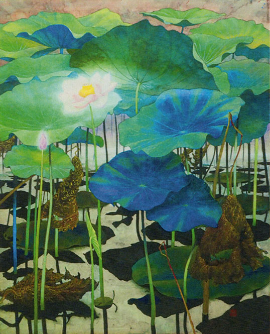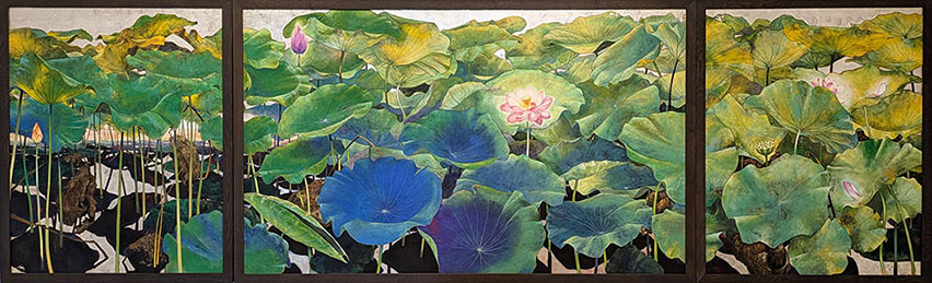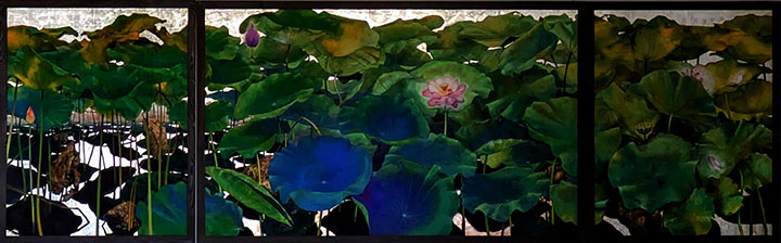 一方、蓮をテーマとした二つの作品は題名からも宗教的な作品であることがわかる。画面の下に配置された枯れた蓮の葉と、中央に白く輝く蓮の花は、連綿と繰り広げられる今生の生命と死の永遠の物語だ。これは今生の世界であり彼岸の世界。さらに蓮の葉の描写は仏教徒でもあった若冲の動植綵絵を彷彿とさせる。この精細な筆の技は油絵具では至難の技だ。司馬江漢以来の日本画と西洋画の高度な融合を果たしたといえるのではないか。