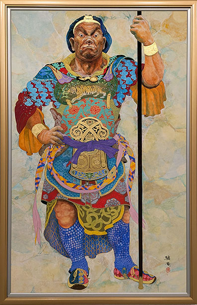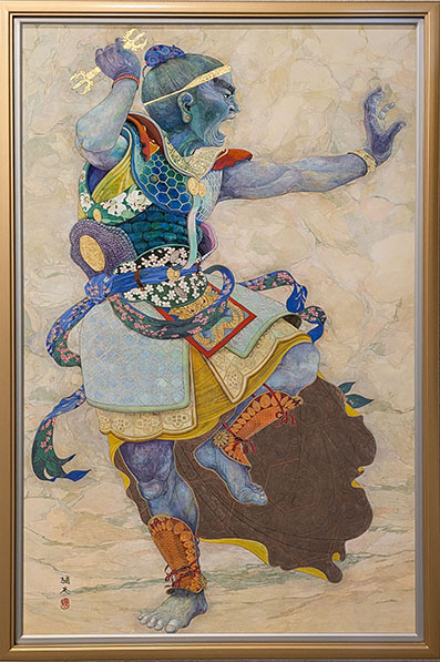 今回、奥の部屋で展示されている石川氏の十二神将は、筋肉質で彫刻的であり、染川先生の弟子であることを感じさせる。さらにそのグラデーション豊かな優しい色彩は、誤解を招く言い方かもしれないがアニメ的でもあり、若い人や外国の人にも親しみやすい新たな時代の仏画といえそうだ。
