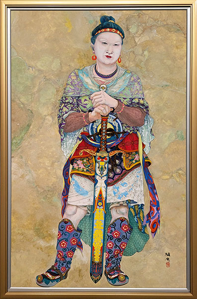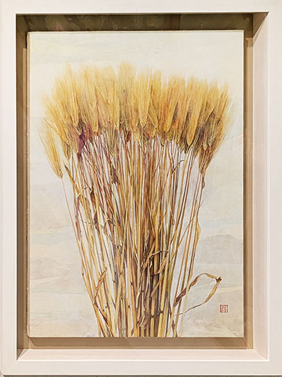 だが、それだけではなかった。第一室に戻りその入り口で見た「麦」がすでに足を止めさせていたのだ。その束ねられた勢い、一本一本の穂先にまで行きとどいたまなざし。作者の並々ならぬ気迫はすでに、此処に放射されていたのだ。そして「櫻霊」の大作。地上を彷徨う霊と枝葉に浮揚する天女に込められた意匠が満開の桜の中で見る側の心の層に触れてくる。