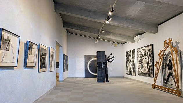 今回の展示は彫刻、造形、写真、インスタレーション、絵画と制作範囲は多岐にわたる。手前の部屋は写真を中心とした2000年以前と奥の2000年以降のアクリル絵画の作品に分けられ、それぞれの部屋には各一体ずつ大きいオブジェが設置されている。