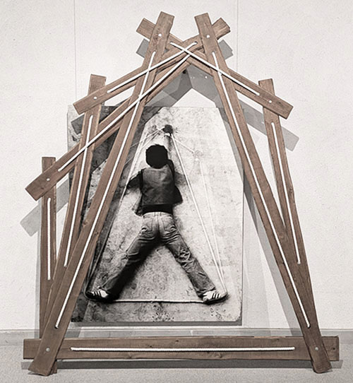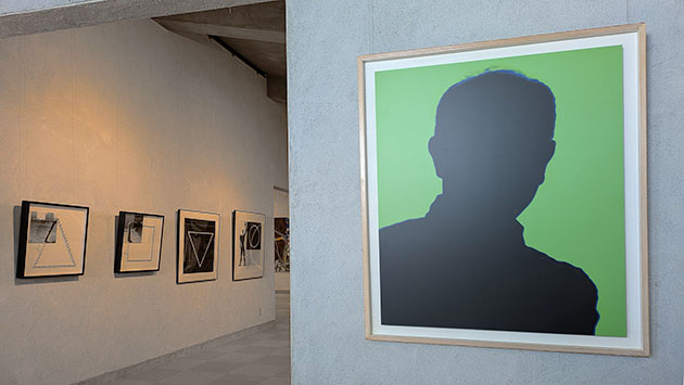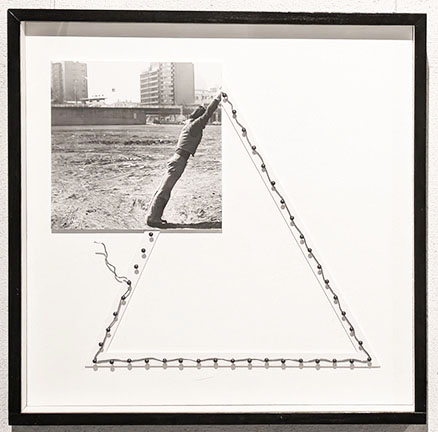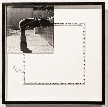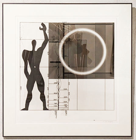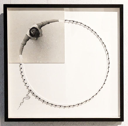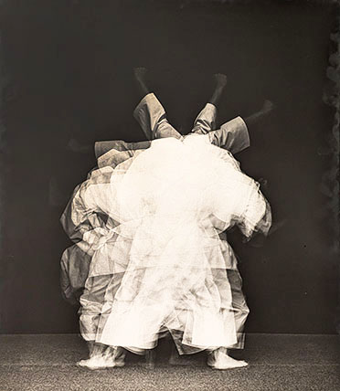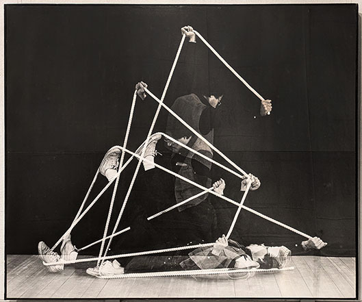 まず入り口では「シルエットグリーン」なる緑色のシルエットの作者に出迎えられる。こちらに向いているのか背を向けているのかわからない不思議で、かつユーモラスなこの人物は多くの絵の中にアイコンのようにメッセージを発している。次に三角、四角、円という幾何学の一部が人体となっている写真作品が並べられる。さらに奥の壁の大きな「気体する身体」の円の一部もやはり作者の姿。当時最新のパソコンの画像処理による白く発光するような円環の背景には白い点が散在し宇宙のようだ。その左隣の二点「北京の朝」と「北京の夕べ」は、白い服の人物が回転する様子を多重露光した作品。右にはやはり「気体化する身体」シリーズの合成写真による見ごたえのある遺跡の多重露光作品が二つ。いずれも貴重な印画紙の作品。さらに作者がローブを手にもって突っ張ったポーズの人物が多重露光されている「線としての身体2」「Deformation4」。手により引っ張られたロープは直線と化し、二つの点があれば線が生まれ、様々な点同士を結ぶと形ができる。その形は写真として多重露光されて、時間が積層された作品となった。その写真は、こうしたパフォーマンスの記録でもあるが、それだけではなく、写真化した作品なのだ。主体はパフォーマンスなのか、写真なのかという迷路に踏み込むことになる。しかしこれはどのように位置づけるのか。マン・レイは造形作品を作り、それを写真にとって作品としたがそれと同様だ。