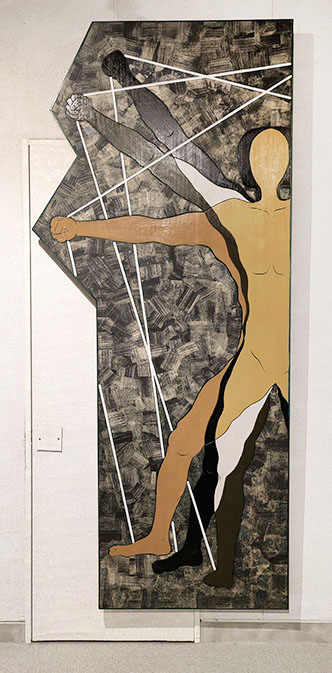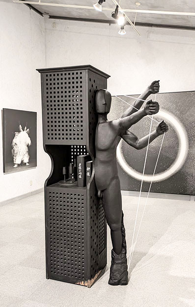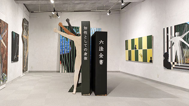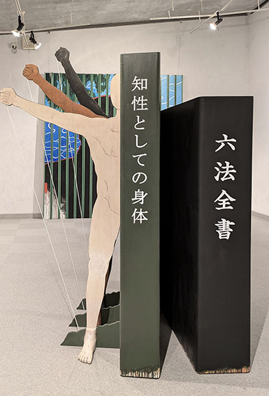 次にオブジェに移る。手前の部屋の「家具と身体」はオブジェの半分は艶消しの黒い格子組による箱型の立体だが、その内部にも仕掛けがある。箱の中央の棚状のところにはやはり黒いワイングラス状のものが三体置かれて思わずピュリズムの静物の作品群を思い出す。その横には白い字で「身体と心体」、「神体」と書かれた二つの黒い本が立てかけられた。その横には人よりも大きな黒い人間の半身のオブジェ。三本の手が突き出てそれぞれ白いロープと足がつながっているがこの仕掛けを作ることは容易ではない。作者は木加工も自由自在で、造形も発泡スチレンを元に石膏、ファイバーグラス、和紙、塗装と技術も一流だ。奥の部屋のオブジェ「知性としての身体」も似ているが、黒、茶、白、三色の三つの半身の人物の横は巨大な本になっている。一つには六法全書と大書されているその本も実に本物のようによく出来ている。人々の生活を規定している法律という意味だそうだ。すべてにおいて何かぎこちないまるで機械のような人間。それらは黒ないし一色に塗られて機械の一部に化したかのようでもある。そして人の心はどこに存在するのか、と作者は問う。一方、これらを発想する頭の中はどうなっているのだろうかと考えてしまう。