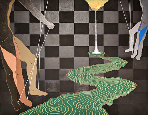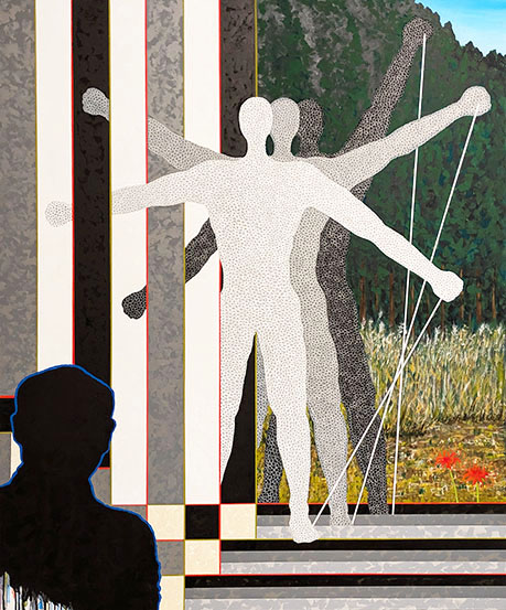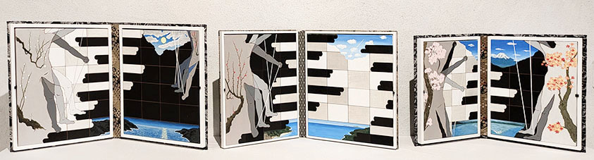 奥の展示室にはアクリル絵の具による大きな作品が並ぶ。高さ2.7mの異形の「記憶4」ではアクリル絵画に墨の作品をコラージュした。中央の3メートルの巨大なストライプの「記憶1」はさらに圧巻の迫力。その棒状の緑のラインは貼り付けてあるから造形作品でもある。作者とおぼしき巨大なシルエットの人物が大胆。そして前述の白いロープを引っ張った人物の作品はカラフルな格子、ライン、円などの幾何学で構成される「多重的身体」の大作。最新作「光琳へのオマージュ」は光琳の紅白梅図にある中央の流れに、光のエネルギーを感じる滝が落ちる。その奥には日本の富士山が象徴的に立っている。さらに本仕立てにした二曲屏風のようなアイデアの作品「春の夜」、「春の昼」「春の秋」が三つ並ぶ。現代といにしえの世界が一体となった作品である。