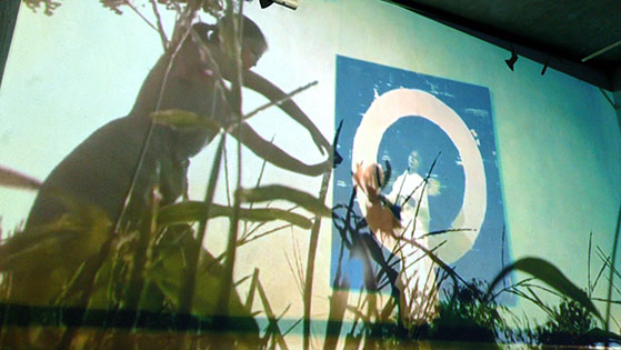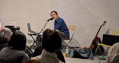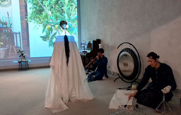 中嶋氏は様々な楽器を駆使するプロミュージシャンだが音楽だけでなくCGの映像作家でもある。様々な自然風景と合成され、またかつての竹内氏の上野原の古民家や2022年に当館で開かれた平松輝子の墨作品を前にしてのパフォーマンスをプロジェクターで投影しながらの演奏は多重で幻想的。特に後者はひきちふみえ氏も参加し、神聖な儀式をしているかのようで、その迫真の舞は緊張感が漂う。