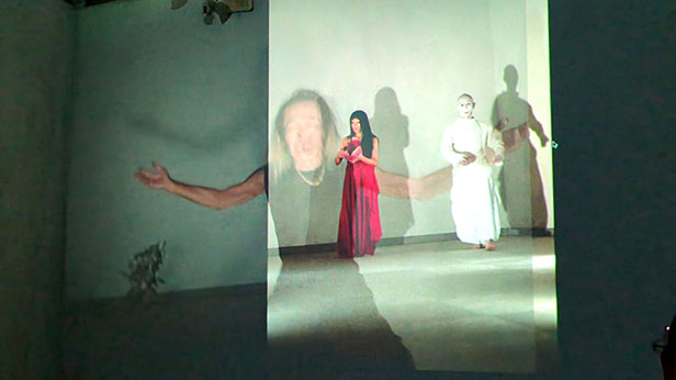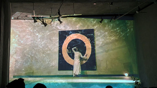 宇フォーラム美術館での白熱のパフォーマンスの再現ビデオ。平松輝子の作品の前で、宇宙創成の神々の物語。古事記のイザナギ、イザナミ。