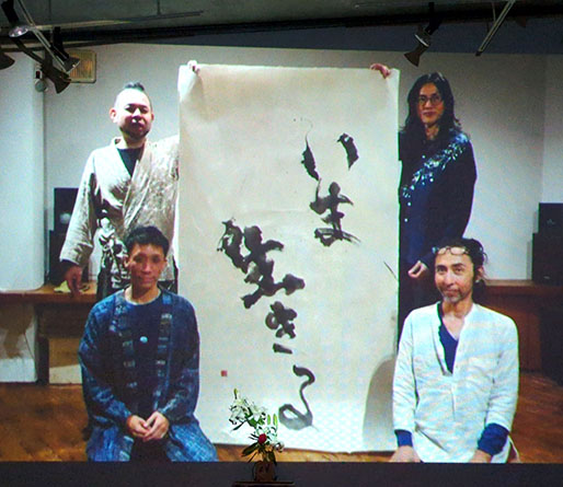 書家の遠藤夕幻氏が、アグレアブルミュゼにて空豆氏を元気付けようと、大きな和紙に「いま生きる」と書いた時の映像が披露された。空豆氏の最後の映像である。左上より、遠藤夕幻氏、稲垣遼氏、山本コヲジ氏、空豆氏
