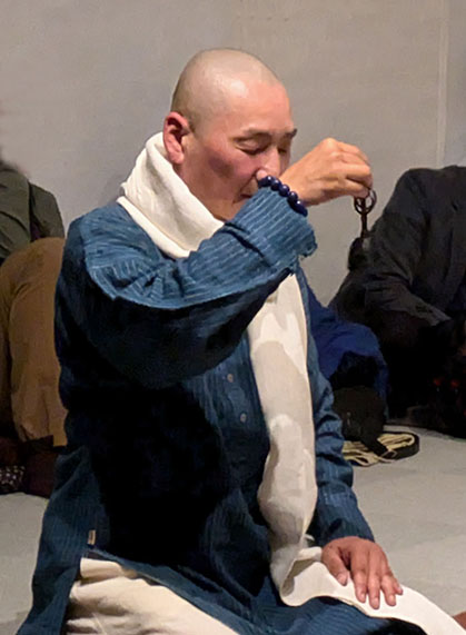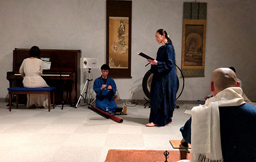 KNOB氏による神道の弔いの詞と般若心経の読経及び中野妙香氏による現代語訳の朗読。背景の掛け軸は左「悲母観音像」、右「白衣観音図」