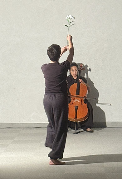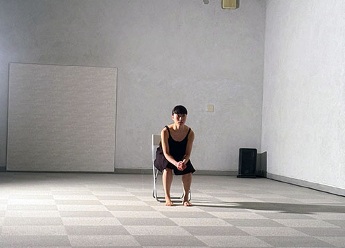 丸い金属のスツールイスの上でくねくねとポーズをとる。少し倦怠的な曲。二人で組み合うようにして戯れる。かくかくと首を曲げたり、腕をふりまわす切れのいい動き。壁の影もきれいだ。チェロの無伴奏バッハ組曲が流れ、それに合わせて踊るような動き。井上陽水のダンスはうまく踊れないという曲はあえて、ダンスというより動きを追求することによる選曲だろうか。演者二人は倦怠的な曲が流れる中、組み合うようにダンスを踊る。この二人の関係性「狭間」を表したのか。