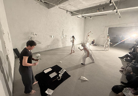 奥の部屋では主人公が正座して墨で書く。書いたばかりの和紙を持ち踊る人や、それを次々に壁に貼っていく人、あるいは、くしゃくしゃにして捨てる場面も。主人公の苦悩や思いを綴った和紙には、「生きているから」「愛」「なぜ踊るのか」「空」「宇」「宙」などのメッセージが書かれ、次第に壁を埋め尽くす勢いで貼られて行く。考えると、絵とはメッセージであり、それを展示する場が美術館である。書のパフォーマンスを美術館で行うということは、井上有一などの例があるが、それをさらに壁に貼るというパフォーマンスはおそらく前例がない。その発想とアイデアに驚く。主人公の、思索、願いはそのまま文字となり展示され、観客に伝わる。まさに題名通り「メッセージ」そのものである。その中で、「なぜ踊るのか」という言葉があった。その答えは「踊りたいから踊るのだ」というように私は感じた。それを体現するかのように館内をダンサーたちは会場狭しとばかりに踊る。そのスピード感、技、美しさはそれぞれコンクールで受賞した力量を示している。奥の部屋では見事なチェロの演奏が始まり耳を奪う。さらにチベットシンバルという民族楽器の澄んだ響きが館内に響く。最後の白い菊を高く掲げて終わる。それは振付として完成している。一番重要なメッセージだと思える白い菊に込めた思いは果たして何だったのかと考えた。白い菊は花言葉でいくつか意味があり、そのため逆に何を象徴していたのかがミステリアスな印象になった。