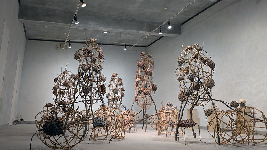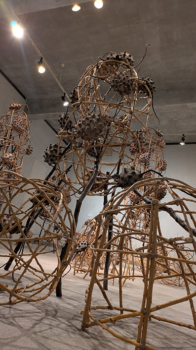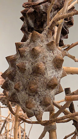 ともあれ、作者が布から三角錐の小さな棘を生成させ、それを集めて実となし、実を繋げて小空間を作り、さらに桑の枝で連携させる……その生成過程こそ、植物のさらには動物、そして人間の個と集団の問題を見事に投影させ得る立体アートに創り上げていると感嘆する。哺乳類の多くは四つ足、そして人間は直立二足歩行。一方この不思議なトゲトゲの実は三本足なんだ……とも。