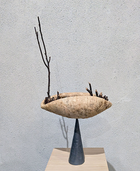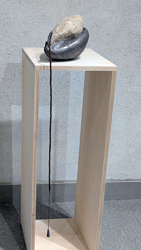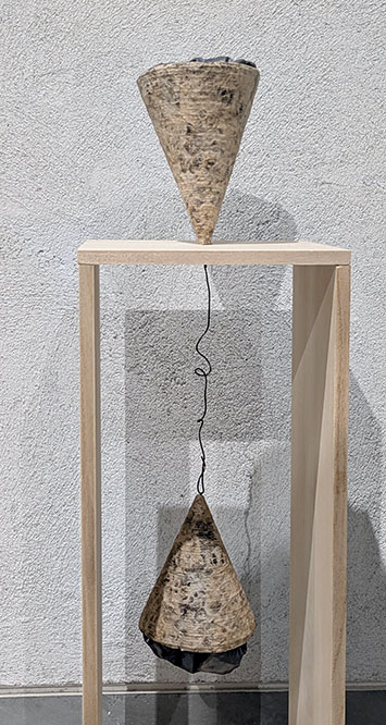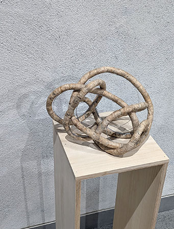 2、 壁に沿って10の作品が展示された。それぞれ樹皮布を使ったシリーズだが、さらに鉛シートを使い、円錐形から、何やら絡み合った立体の知恵の輪のようなものなど様々だが、いずれも抽象的な形態。人を笑顔にするように柔らかく、少しユーモラス。さらに最後の作品の台の下部にもう一つの作品というアイデアが斬新。