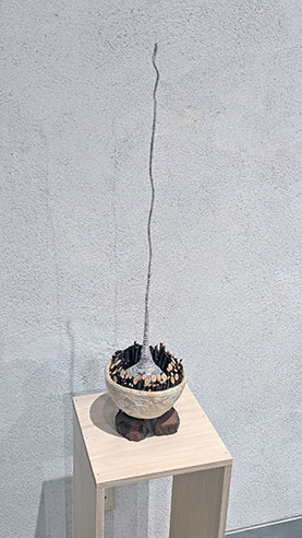 今回、二階奥の第二室では、それらの実がどこか大小の家族のように纏まり、それがさらに外へ伸び、家族間の繋がりのようなものに展開されている気がした。実に見応えのある立体作品群だ。繋がりの大きな家系的なものと、中くらいのそれと、一、二の家族程度のものと三種が配置され、さらにそこから外れたような実が二つの繋がりと、たった一つのものと~~隅に潜んでいた。
