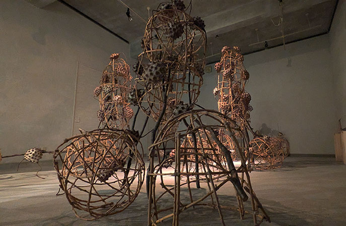 3、 インスタレーション「樹皮布を触る」は会場いっぱいに広がる植物、有機物体のイメージ。この会場では今まで様々な個性的なインスタレーションが生まれた。今回は、桑の枝をラグビーボールのような長球体に組み、それに3本脚の動物?、昆虫?が這いまわっている。材料はインドネシアの熱帯樹の樹皮布により作られた一種の紙(不識布)を複雑に成型し、人工的なイメージはない。それらが、会場いっぱいに増殖するとともに、高さ約2.6mに巨大化、ジャングル化し、観客はその間を探検する。それはこの独特の会場がなければ成り立たない作品。例えば、この作品が新国立美術館にあってもそぐわない。さらに、この大きな作品はどのように写真に撮るかでイメージは変わってしまう。照明の仕方でも変化し、同じ作品とは思われない。これは会場と二人三脚で生まれたともいえよう。さらに風が吹き鳥の声が聞こえればここが美術館とは思えない。制作過程を少し説明すると、着色した数えられないほどの樹皮布を円錐形に成型した後に白い釉薬をかける。それらはいったん組んで目印をつけて会場で元のように組み上げた。それには気の遠くなるような時間と根気が必要だったと想像できる。そうした表現を求める意欲はどこから生まれてくるのだろうか。さらにその目的は?今回、それは造形であると同時に空間であり、ひとつの世界なのだ。それはもしかしたら子供の時、遊んだ林や野原、草原の無意識の再現なのかもしれない。そこには様々の昆虫が潜んでいたに違いない。昆虫好きの学者、養老孟のいう現代の人間中心の世界観への反発なのか。あるいは人間も虫の一つなのかもしれない。さらに言えば自然回帰ともいえそうだ。芸術家の深層心理を知りたくなる。作者は、まさにこれを作りたかったから、というだろう。それは一般人と明確に違うところ。だから真の表現者なのだ。